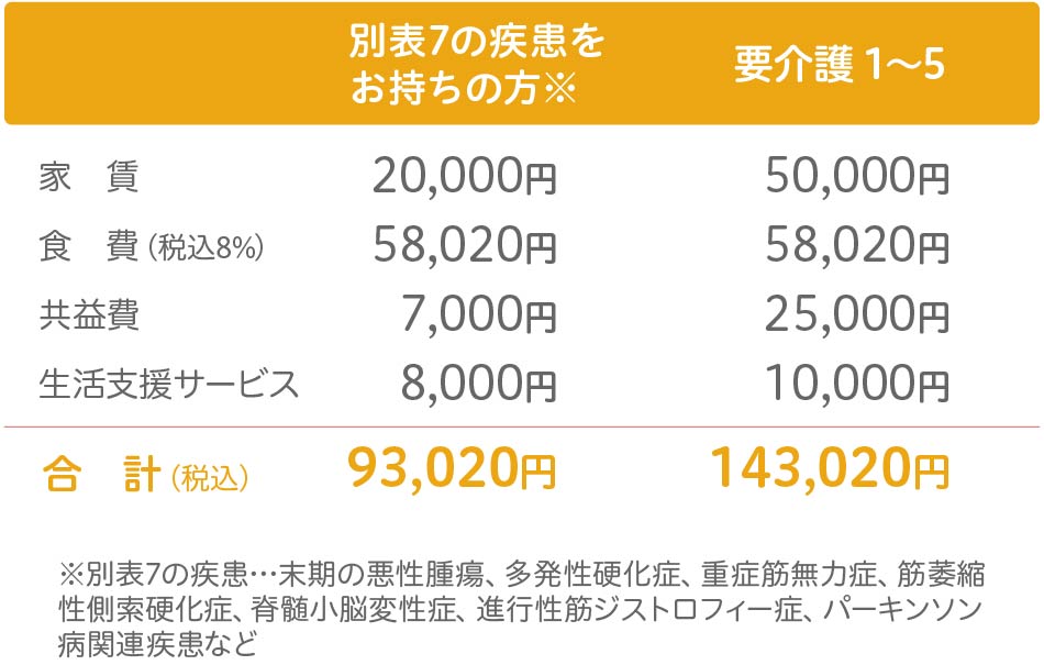 A. 月額利用料:家賃、食事代、生活支援サービス、共益費、などが含まれます。